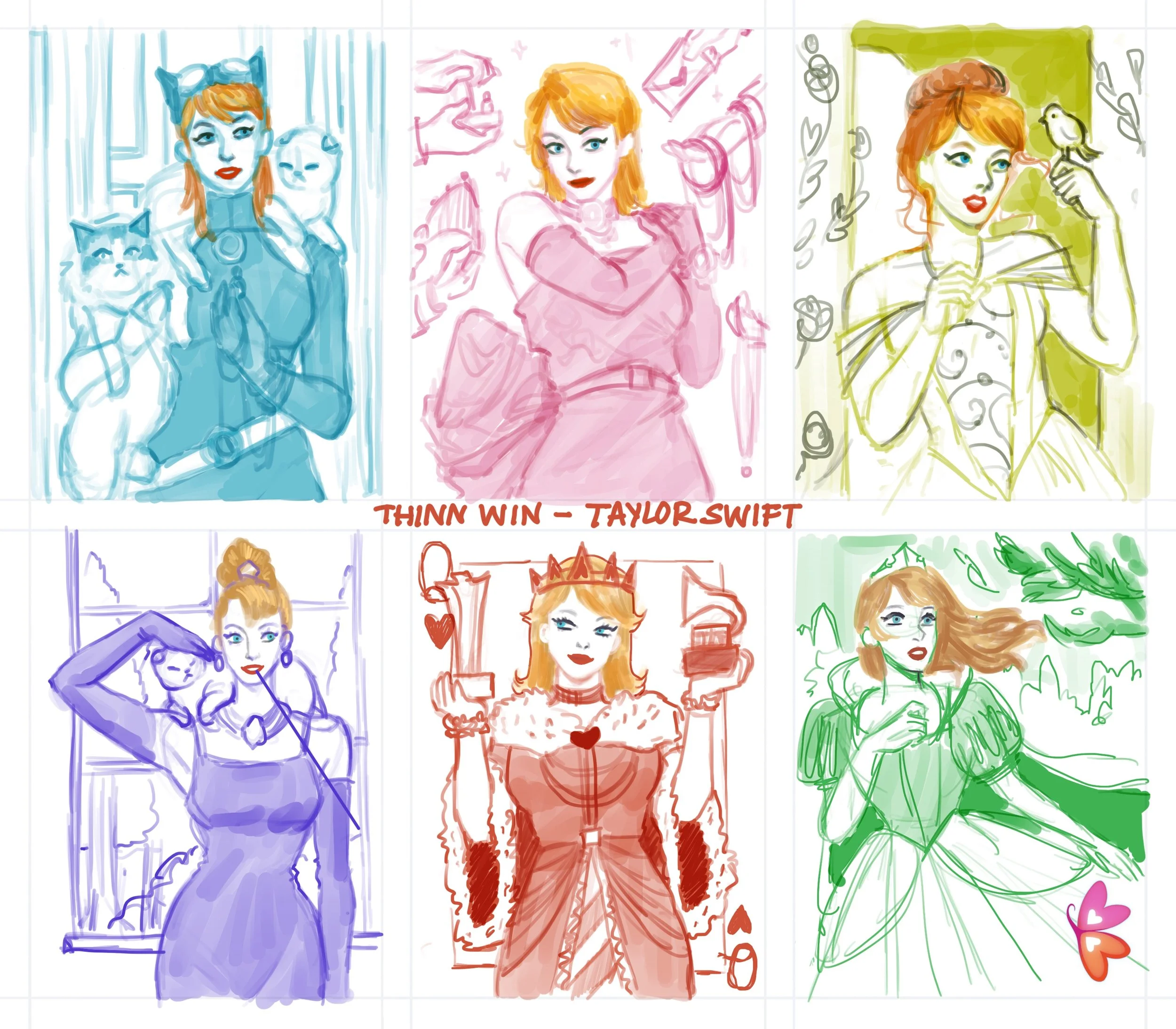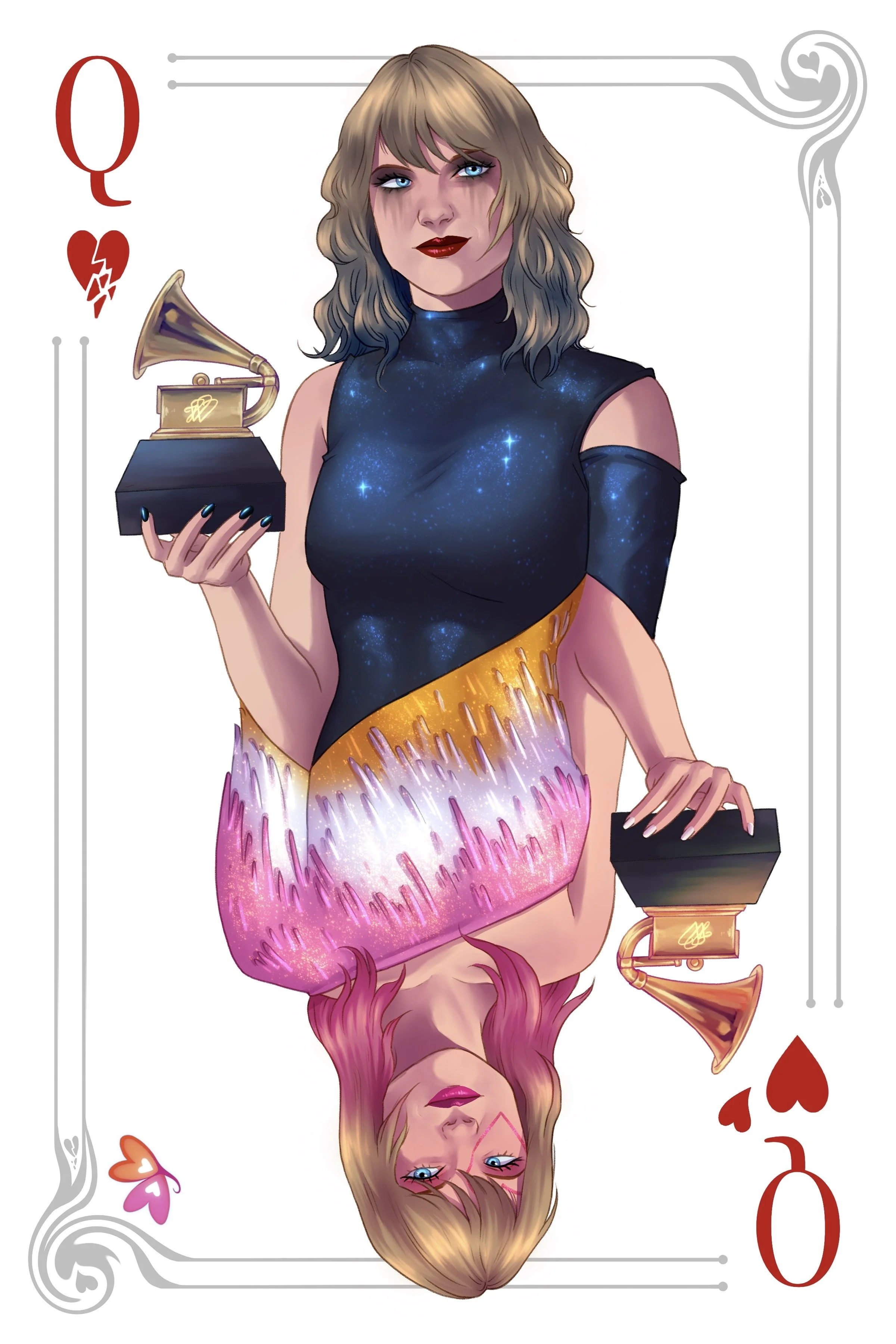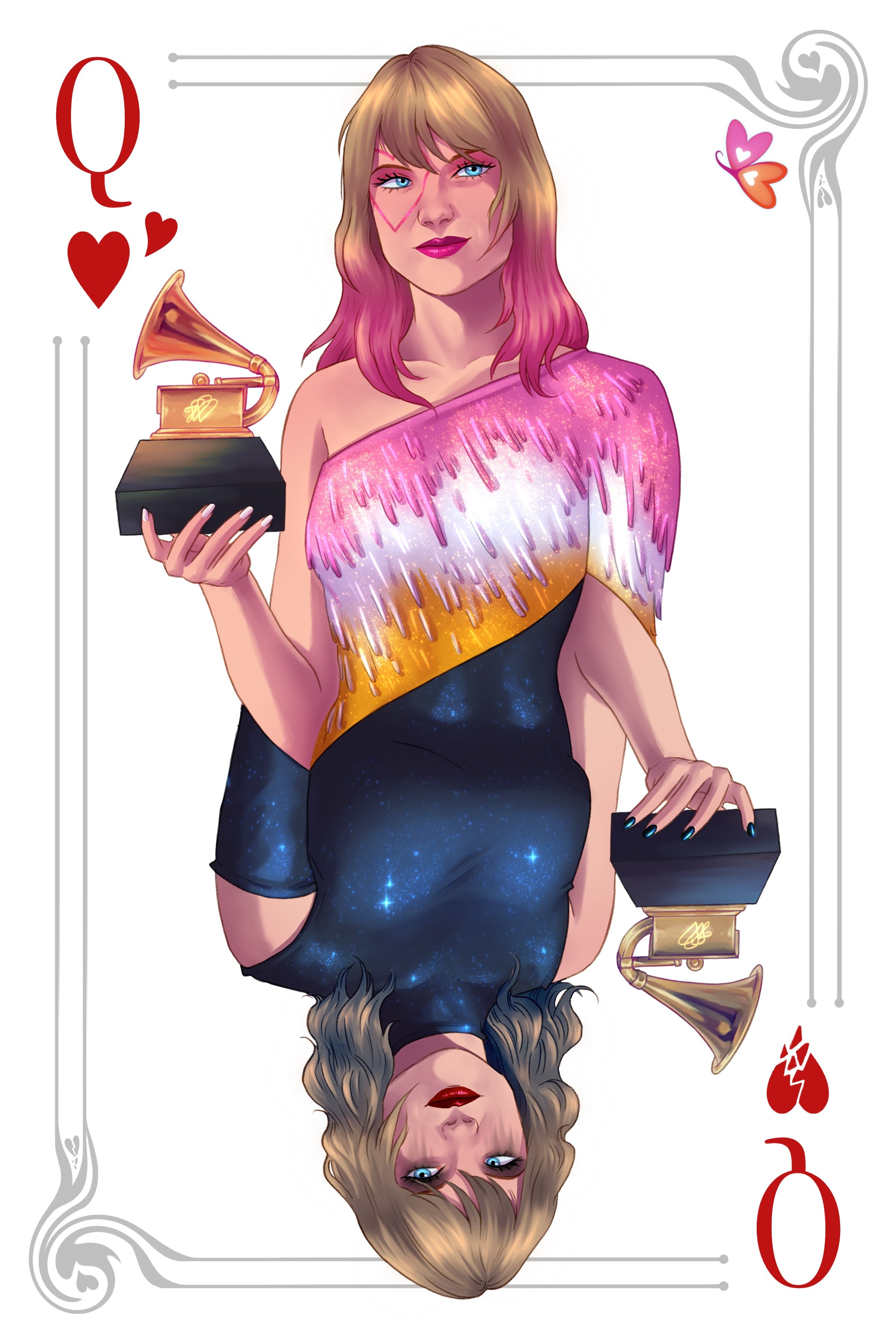 A celebrity portrait of one of my favorite artists, Taylor Swift. I made many concepts for this trying to capture her personality and how she’s seen as by the public; the cat lady, the material girl, the fairytale princess, and the queen of hearts (and the Grammys).
