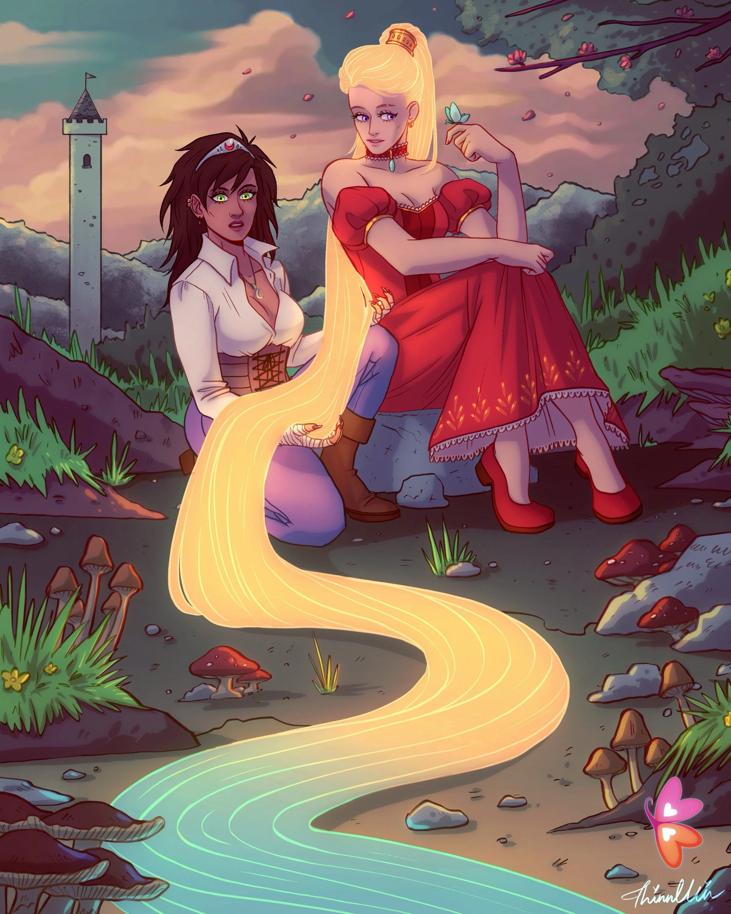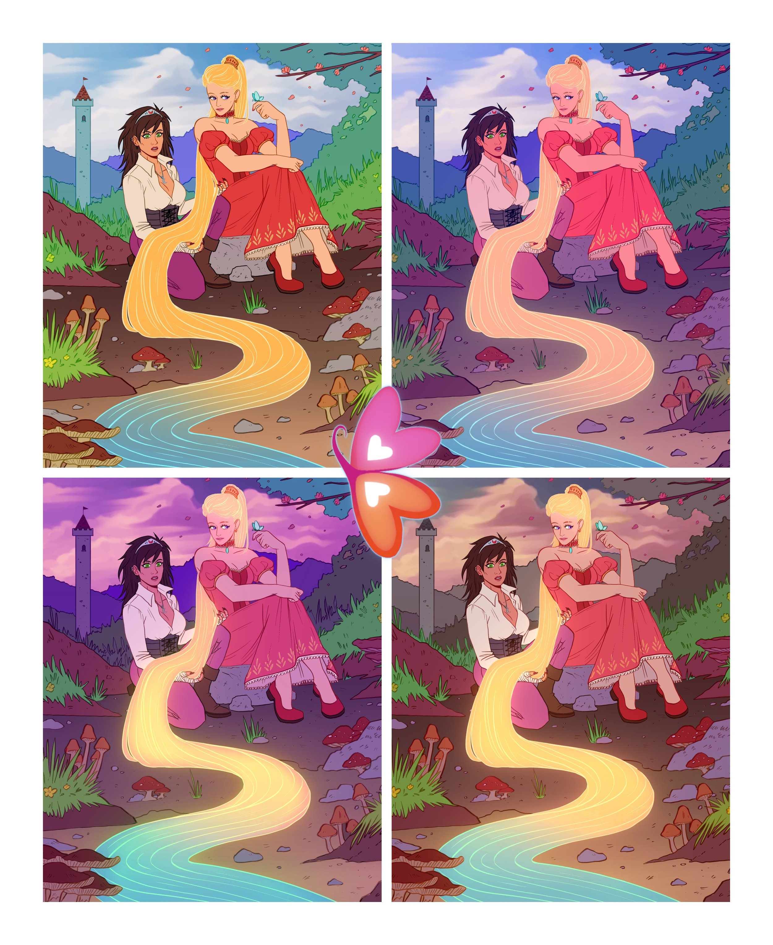 My illustration and concept for making a sapphic version of Rapunzel, as well as exploring how different color palette and lighting can effect the mood of the story.