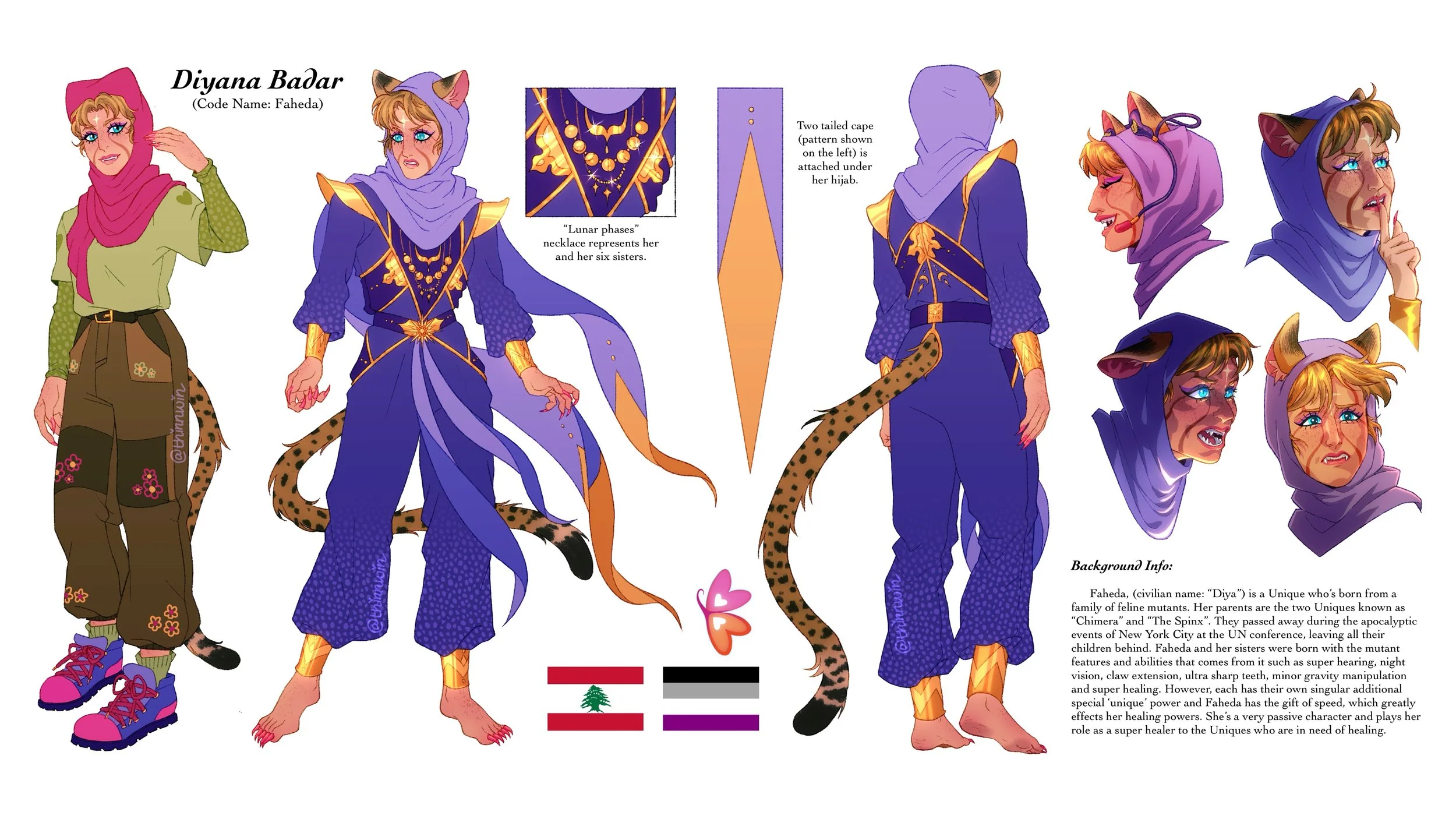 As a child of middle eastern descent, I wanted to create a superhero that represented part of my ethnicity. Her and her sisters are inspired by different parts of the Middle East, Diyana’s design being inspired by Lebanon. While researching for the designs of the characters, I mailed back and forth with the artist couple as well as with a Lebanese writer and friend, Cher, who’s currently living in Beirut, and is greatly in touch with the customs, history and culture.